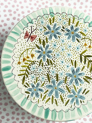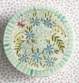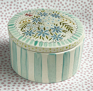 I painted this 4-inch round earthenware box with stripes and put a transfer of one of my designs on top. It is large enough to hold all of your treasures and will sit happily on your nightstand, bureau, or table. It is something you will treasure for years to come!
