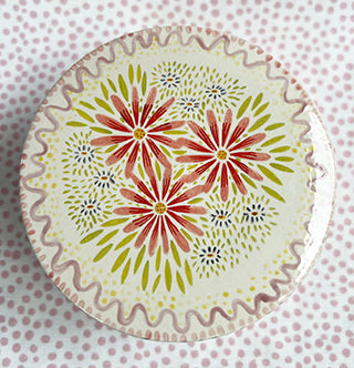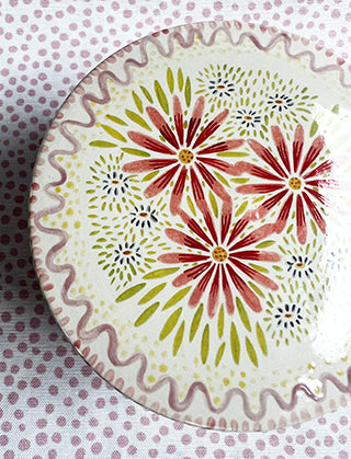 I painted this 4-inch round earthenware box with stripes and put a transfer of one of my designs on top. It is large enough to hold all of your treasures and will sit happily on your nightstand, bureau, or table. It is something you will treasure for years to come!