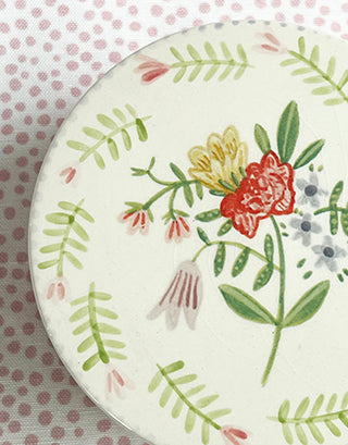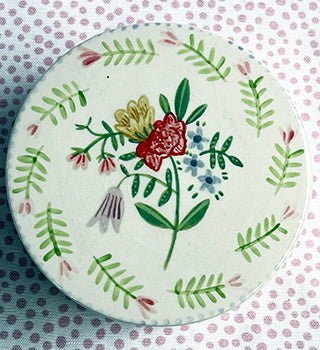 I painted this 4-inch round earthenware box with stripes and put a transfer of one of my designs on top. It is large enough to hold all of your treasures and will sit happily on your nightstand, bureau, or table. It is something you will treasure for years to come!