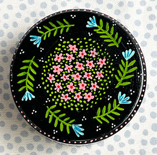 This box was handmade in Europe. It measures 3 inches round and 1.3 inches high. I hand-painted it with acrylic paints and finished it with a water-based varnish. Unfortunately, I won't be able to get them anymore. They are a treasure to hold your treasures. Enjoy!