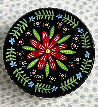 This box was handmade in Europe. It measures 3 inches round and 1.3 inches high. I hand-painted it with acrylic paints and finished it with a water-based varnish. Unfortunately, I won't be able to get them anymore. They are a treasure to hold your treasures. Enjoy!