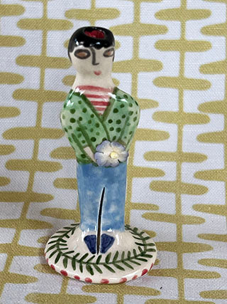 I made this little peep out of earthenware clay. I painted it with colorful cloths and glazed it in my kiln. Voila! A happy friend for all occasions! It measures about 3 inches tall, and looks good on cupcakes, tarts, and Birthday cakes. Light them every night at the dinner table for a nice glow.