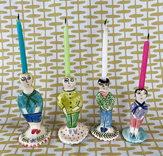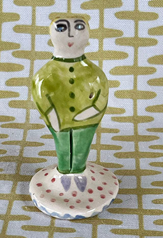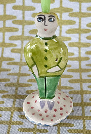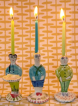 I made this little peep out of earthenware clay. I painted it with colorful cloths and glazed it in my kiln. Voila! A happy friend for all occasions! It measures about 3 inches tall, and looks good on cupcakes, tarts, and Birthday cakes. Light them every night at the dinner table for a nice glow.