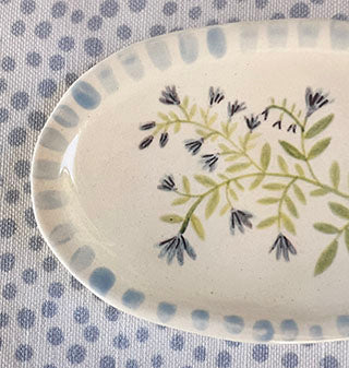These dishes measure between 3 x 2 inches. They are hand-made from earthenware clay. I paint tiny dots or stripes around the edges and then add a design of mine, which I fire into the clay. A sweet little dish for your rings or earrings, or vitamins!  It makes a great little gift as everyone could use a wee dish!