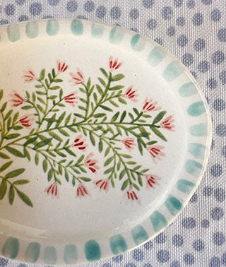 These dishes measure between 3 x 2 inches. They are hand-made from earthenware clay. I paint tiny dots or stripes around the edges and then add a design of mine, which I fire into the clay. A sweet little dish for your rings or earrings, or vitamins! It makes a great little gift as everyone could use a wee dish!