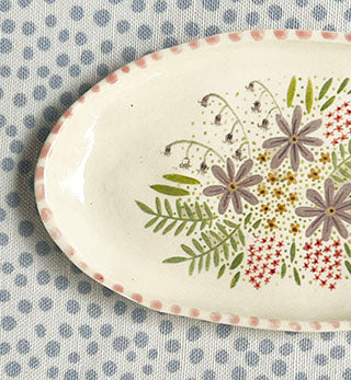 This is a 3.5-inch oval dish hand-made out of earthenware clay. I painted the design and made a transfer from it. Then I fired it in my kiln. Dishwasher and microwave proof!