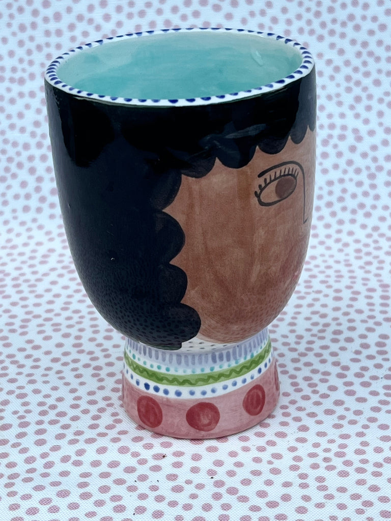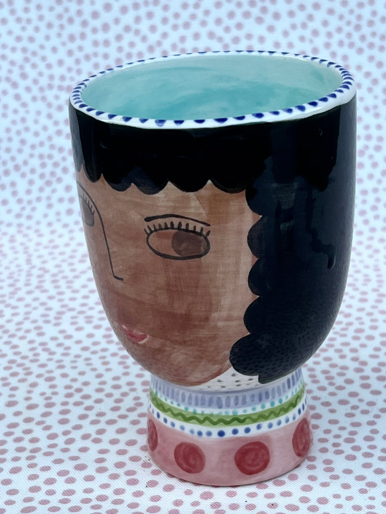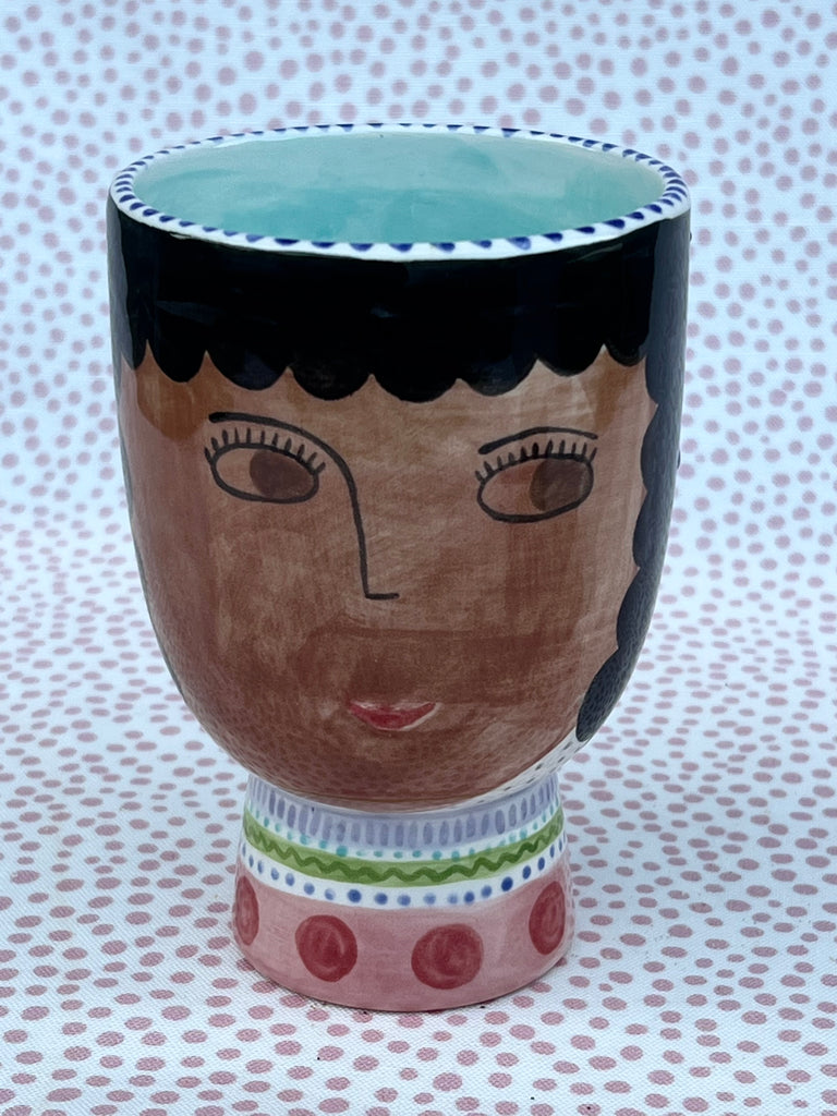 You will love your new friend! She measures 5" H x 3 ⅜" Dia. and is perfect for holding tea, coffee, or flowers. She is hand-painted on earthenware bisque with lead-free glazes and is dishwasher safe.