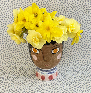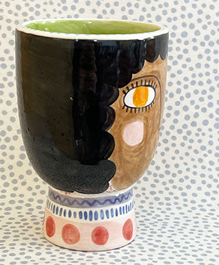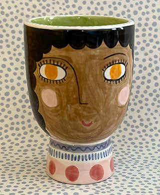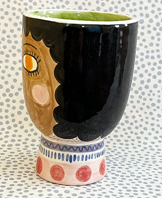 You will love your new friend! She measures 5" H x 3 ⅜" Dia. and is perfect for holding tea, coffee, or flowers. She is hand-painted on earthenware bisque with lead-free glazes and is dishwasher safe.