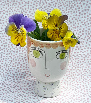 You will love your new friend! She measures 5" H x 3 ⅜" Dia. and is perfect for holding tea, coffee, or flowers. She is hand-painted on earthenware bisque with lead-free glazes and is dishwasher safe.