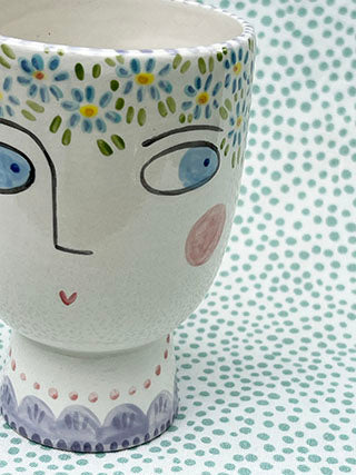 You will love your new friend! She measures 5" H x 3 ⅜" Dia. and is perfect for holding tea, coffee, or flowers. She is hand-painted on earthenware bisque with lead-free glazes and is dishwasher safe.