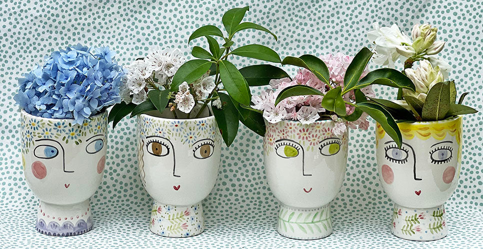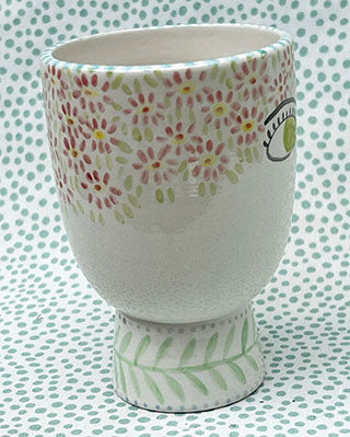 You will love your new friend! She measures 5" H x 3 ⅜" Dia. and is perfect for holding tea, coffee, or flowers. She is hand-painted on earthenware bisque with lead-free glazes and is dishwasher safe.