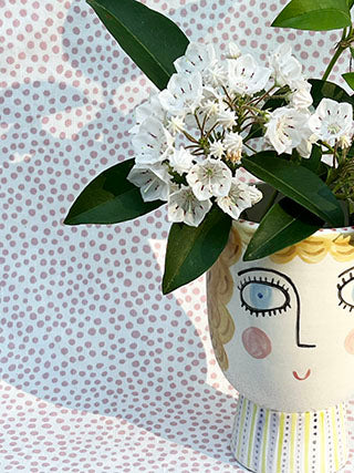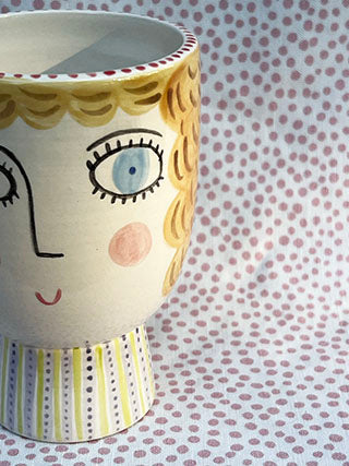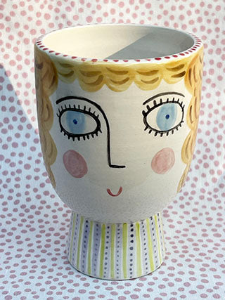 You will love your new friend! She measures 5" H x 3 ⅜" Dia. and is perfect for holding tea, coffee, or flowers. She is hand-painted on earthenware bisque with lead-free glazes and is dishwasher safe.
