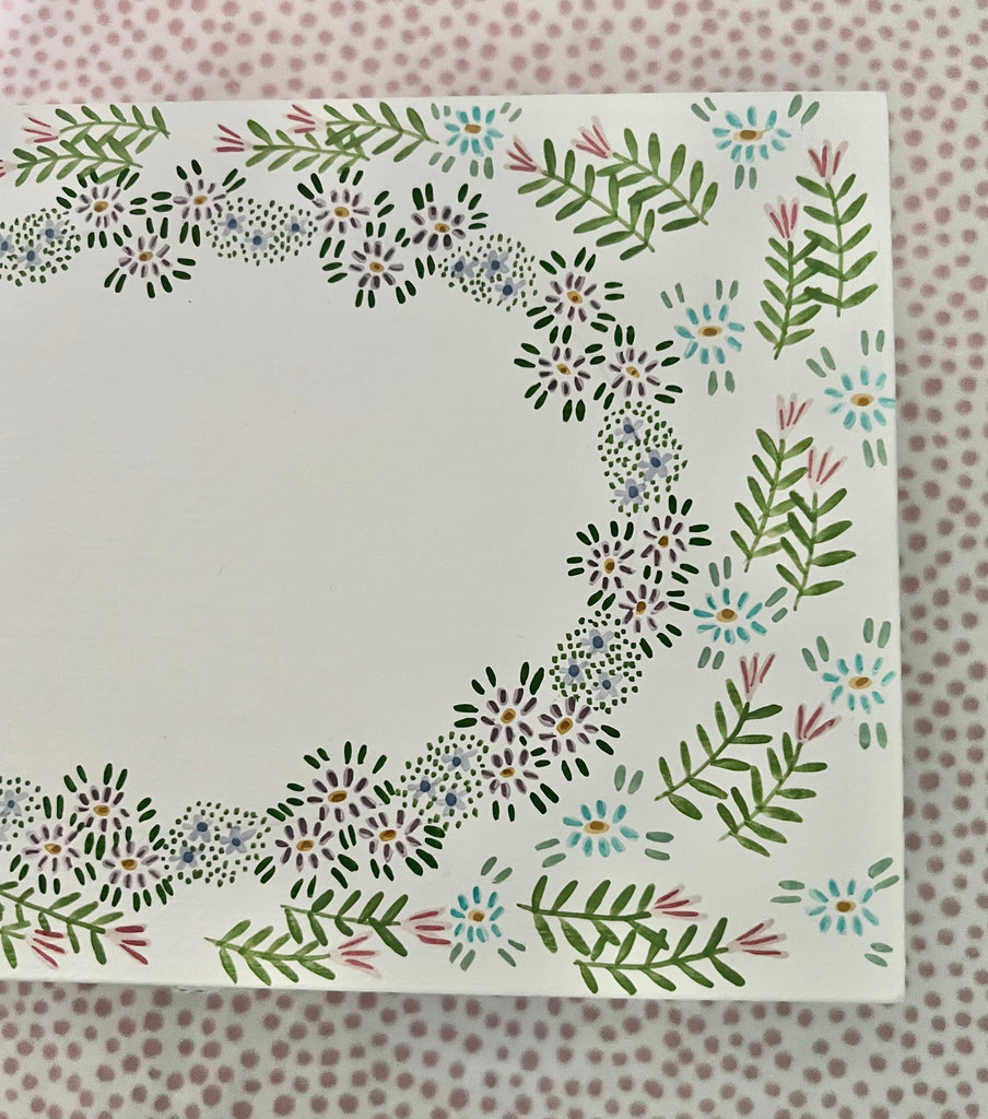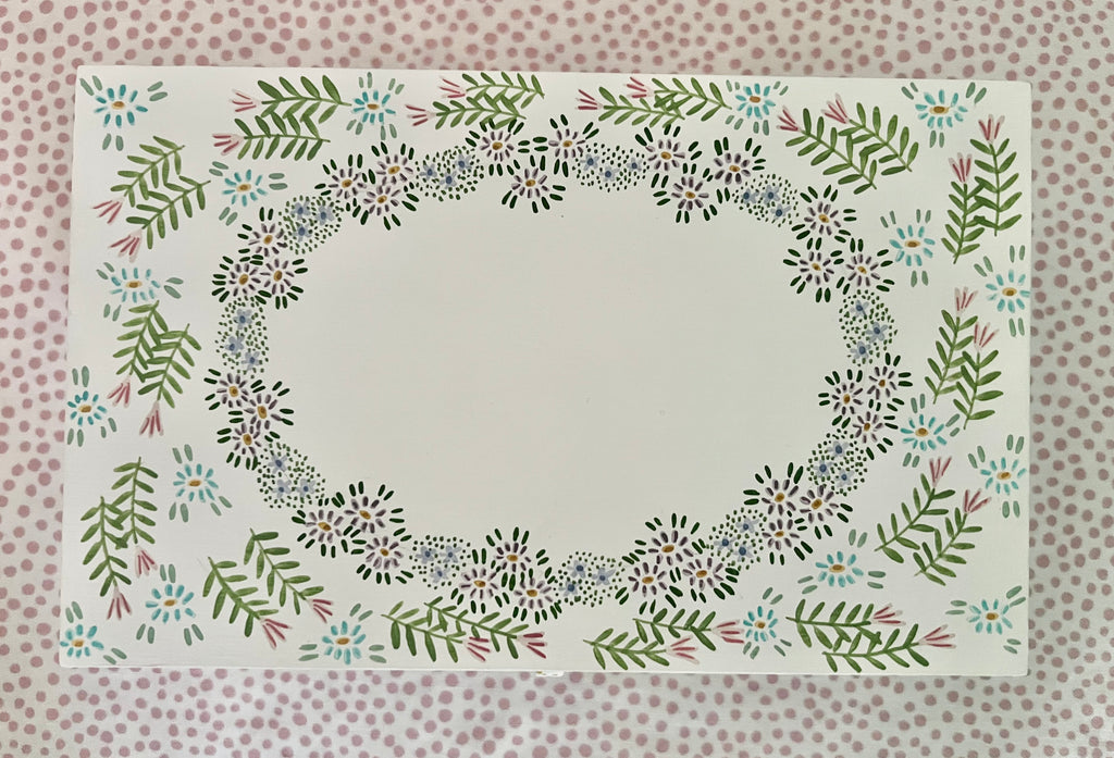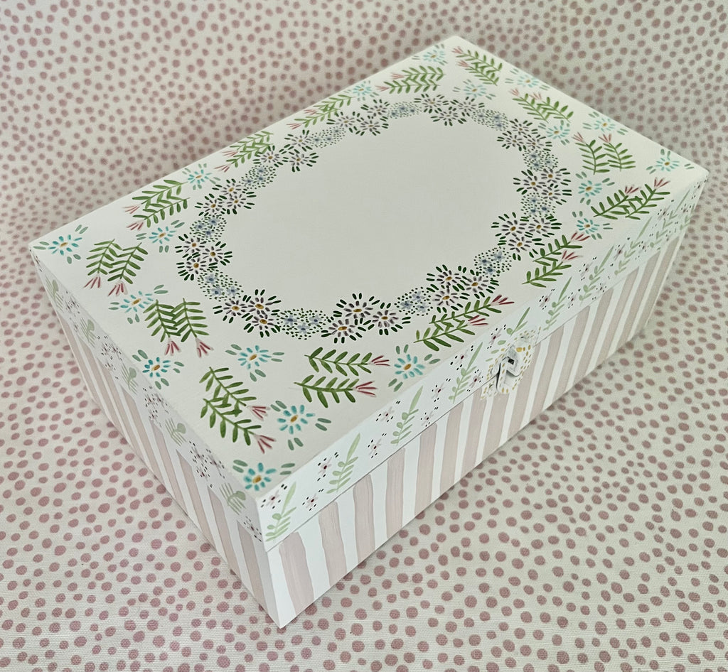 This one-of-a-kind wooden box is hand-painted with acrylic paints and sealed with a water-based varnish. Each one has its own unique design—only one, just for you or a special friend. Perfect for storing knickknacks, jewelry, and love letters.