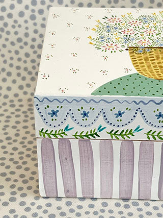 This one-of-a-kind wooden box is hand-painted with acrylic paints and sealed with a water-based varnish. Each one has its own unique design—only one, just for you or a special friend. Perfect for storing knickknacks, jewelry and love letters.