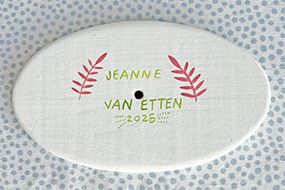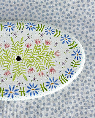 This base is made from cherry wood. It is 6 7/8 inches long x 4 inches tall. It is painted on both sides, but only one side has a design. I used acrylic paint and sealed it with a varnish to protect it from water.