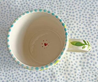 You will love this special mug! It measures 3.75 inches high x 3.25 inches in diameter and holds 12 oz of hot chocolate or your favorite brew.
