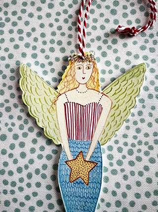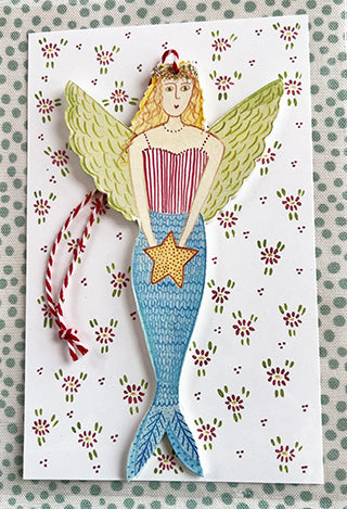 This wooden mermaid ornament measures 3 inches wide x 6 inches tall. I added a candy striped cotton string for hanging. She comes in a clear bag on a floral background. Perfect for gift giving.