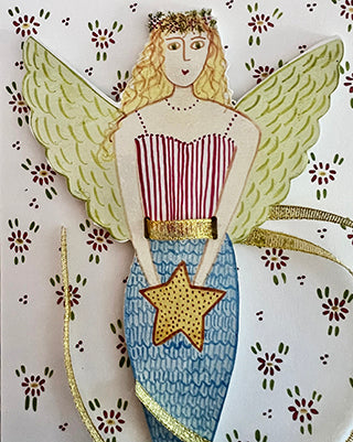 This wooden mermaid tree topper measures 5 inches wide x 9 inches tall. A golden ribbon slides around her waist and can be tied to the top branch of your Christmas tree She comes in a clear bag on a floral background. Perfect for gift giving.