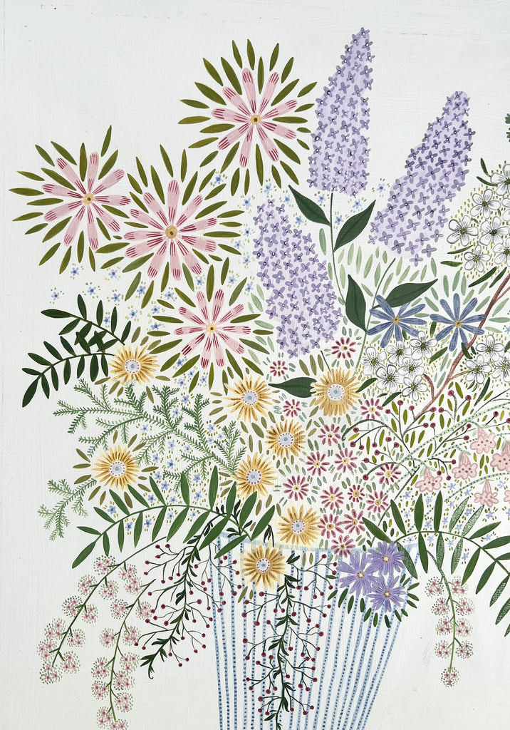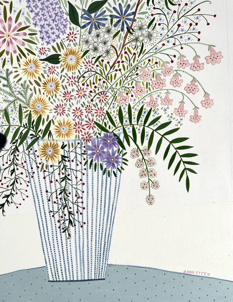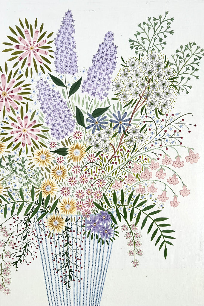 I painted this 18 x 24-inch bouquet when the spring flowers were blooming. There are lilacs, apple blossoms, ferns, vines, and other flora and fauna bursting out of a blue striped vase.
