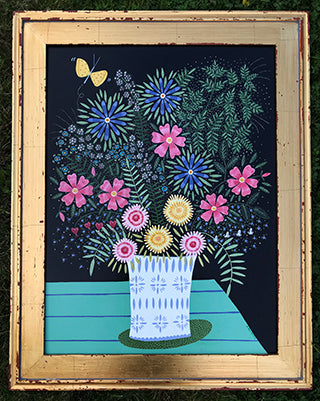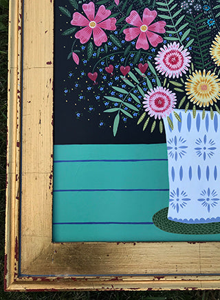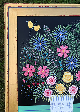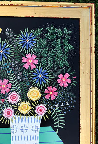 This colorful painting measures 18 x 24 and 28.75 x 22.5 inches with the gold frame. I used acrylic gouache and gave it a varnish to seal the goodness in.