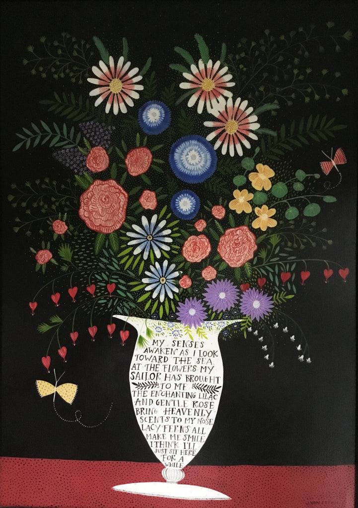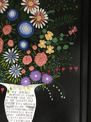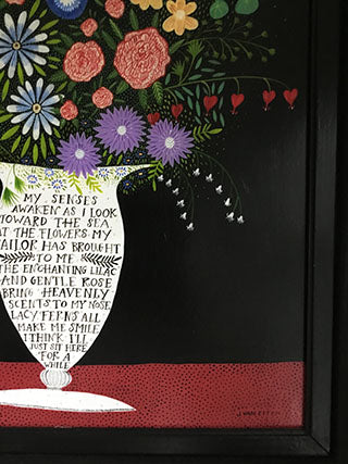 I painted this Sailor's flower bouquet with acrylics and gouache  on a masonite. It measures 18 x 26 inches unframed. It has a black frame on it now that measures 3 inches wide but feel free to change it. No charge for the frame!