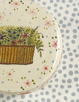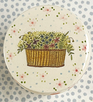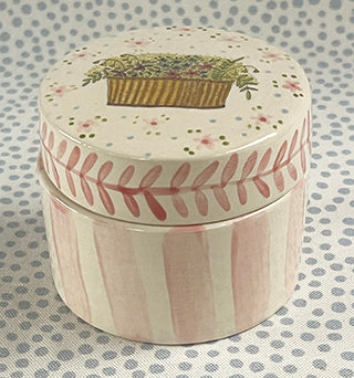 This earthenware box is hand-painted with stripes and vines and has a transfer of one of my designs on the top. I fired it in my kiln, and it is ready for you to keep or give away. Perfect for all of your secret treasures. It measures 2.50 H x 3 D inches.