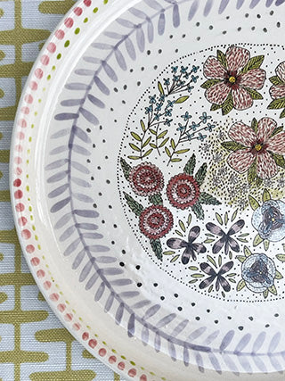 I hand-painted this 6.5-inch round dish and added a transfer of one of my designs. It is pretty enough to look at every day. Use it for your jewelry, a small salad, cupcakes, and cookies, or hang it on the wall. Collect them all for a fun dinner party with friends!