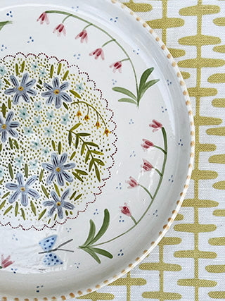I hand-painted this 6.5-inch round dish and added a transfer of one of my designs. It is pretty enough to look at every day. Use it for your jewelry, a small salad, cupcakes, and cookies, or hang it on the wall. Collect them all for a fun dinner party with friends!