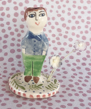 I made this little peep out of earthenware clay. I painted it with colorful cloths and glazed it in my kiln. Voila! A happy friend for all occasions! It measures about 3 inches tall, and looks good on cupcakes, tarts, and Birthday cakes. Light them every night at the dinner table for a nice glow.