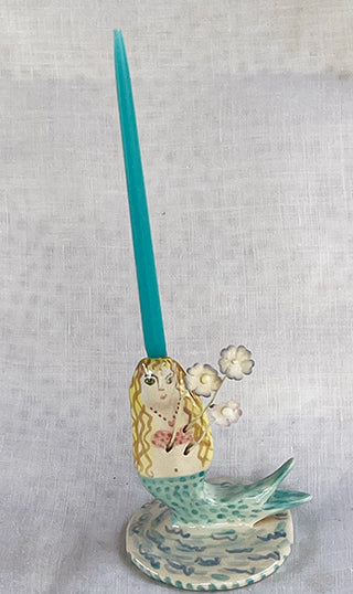 I made this little peep out of earthenware clay. I painted it with colorful cloths and glazed it in my kiln. Voila! A happy friend for all occasions! It measures about 3 inches tall, and looks good on cupcakes, tarts, and Birthday cakes. Light them every night at the dinner table for a nice glow.