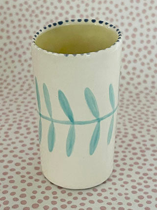 I handmade this one-of-a-kind earthenware vase and handpainted it with a sweet floral and vine design. It measures about 3.5 inches high x 2 inches wide at the top.