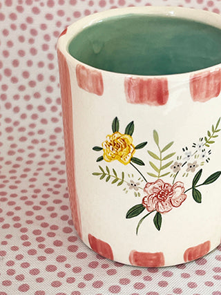 These sweet mugs are handmade out of earthenware clay. I paint the stripes and add a transfer from one of my designs. It is dishwasher safe! They measure about 3 inches tall x 2 inches wide. They are great for espresso in the morning and wine at night. Use them as a wee vase or your toothbrush.