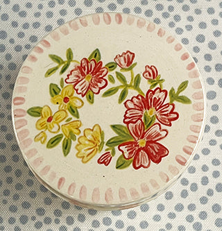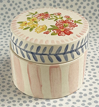 This earthenware box is hand-painted with stripes and vines and has a transfer of one of my designs on the top. I fired it in my kiln, and it is ready for you to keep or give away. Perfect for all of your secret treasures. It measures 2.50 H x 3 D inches.