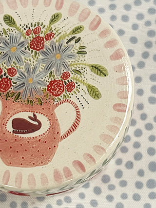 This earthenware box is hand-painted with stripes and vines and has a transfer of one of my designs on the top. I fired it in my kiln, and it is ready for you to keep or give away. Perfect for all of your secret treasures. It measures 2.50 H x 3 D inches.