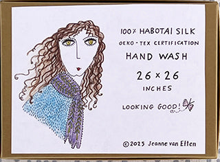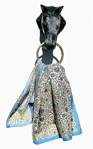 I designed a meadow and transformed it into a classic scarf, crafted from pure 100% habotai silk with machine-rolled edge finishing. The print is permanent and will never fade with use or washing. It measures 26 x 26 inches.