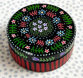 This box was handmade in Europe. It measures 3 inches round and 1.3 inches high. I hand-painted it with acrylic paints and finished it with a water-based varnish. Unfortunately, I won't be able to get them anymore. They are a treasure to hold your treasures. Enjoy!