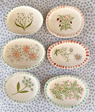 These dishes measure between 3 x 2 inches. They are hand-made from earthenware clay. I paint tiny dots or stripes around the edges and then add a design of mine, which I fire into the clay. A sweet little dish for your rings or earrings, or vitamins! It makes a great little gift as everyone could use a wee dish!